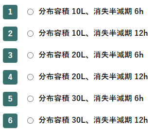 【薬剤】73歳男性。体重60 kg。メチシリン耐性黄色ブドウ球菌(MRSA)肺炎の治療目的でアルべカシン硫酸塩の投与が開始された。この患者におけるアルベカシンの分布容積と消失半減期に最も近い値の組合せはどれか。1つ選べ。ただし、アルベカシンの体内動態は線形1-コンパートメントモデルに従い、3回目投与時点で定常状態にあり、点滴開始後1時間までの消失は無視できるものとする。また、アルベカシン硫酸塩150 mgは、アルべカシン105 mgに相当するものとする。