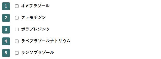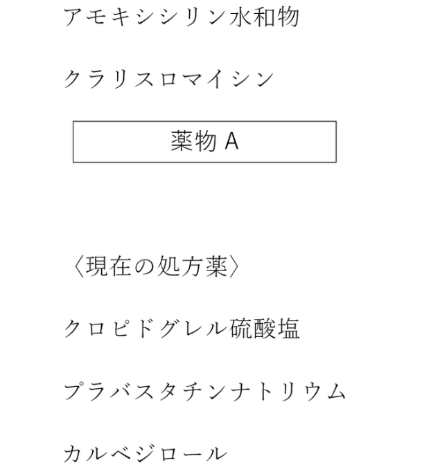 【実務】58歳男性。入院中にヘリコバクター・ピロリの一次除菌を行うことになった。現在処方されている薬剤があり、除菌時の治療薬の選択について医師から薬剤師に問合せがあった。処方は、以下の薬剤を考えているとのことであった。なお、この病院ではDiagnosis Procedure Combination(DPC:診断群分類)制度に基づいて、入院患者の診療報酬を請求している。現在の処方薬を考慮して、薬剤師が薬物Aとして推奨するのに適切なのはどれか。2つ選べ。