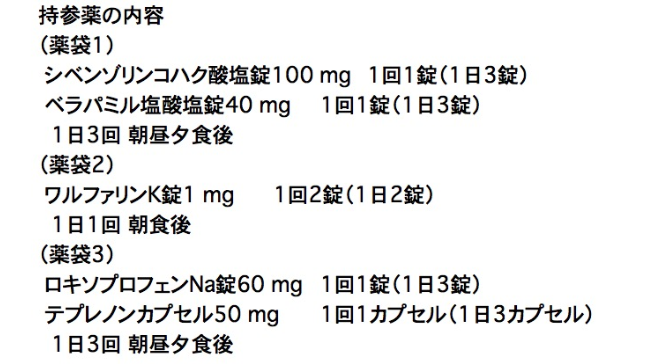 60歳女性。身長150 cm、体重45 kg。めまい、ふらつき、冷汗、軽度の意識障害を主訴として受診し、入院することとなった。入院時に病室を訪問した薬剤師が持参薬を確認したところ、下記の薬剤を日ごろ欠かさず服用していたことが分かった。入院時の血清クレアチニン値1.5 mg/dL、BUN 29 mg/dL、AST 25 IU/L、ALT 30 IU/L、PT-INR2.0、空腹時血糖値40 mg/dLであった。