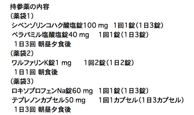 kg。めまい、ふらつき、冷汗、軽度の意識障害を主訴として受診し、入院することとなった。入院時に病室を訪問した薬剤師が持参薬を確認したところ、下記の薬剤を日ごろ欠かさず服用していたことが分かった。入院時の血清クレアチニン値1.5