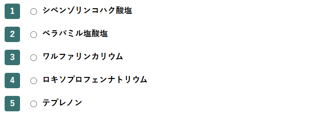 薬剤師はこの女性の主訴の原因として、服用中の薬物の副作用を疑った。最も可能性の高い薬物はどれか。1つ選べ。