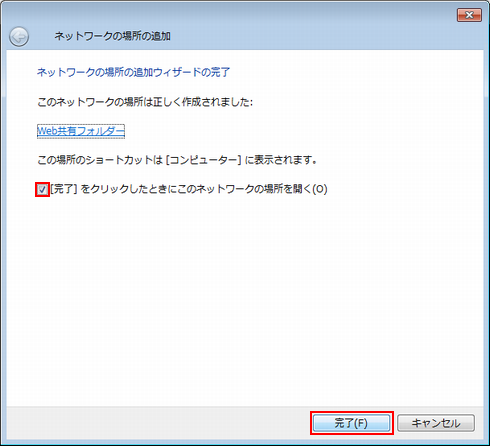 - ネットワークの場所が作成されると、ネットワークの場所の追加ウィザードは完了です。