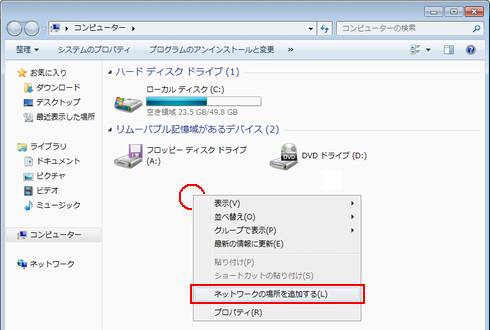 ウィンドウ内の空白部分で右クリックし、「ネットワークの場所を追加する」をクリックします。